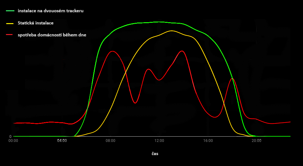 - Příznivější rozložení výroby oproti statické instalaci, tzn. vykrývání denní spotřeby typické domácnosti.